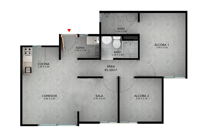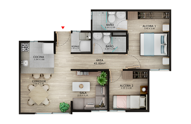 Amplias áreas con 3 alcobas, 2 baños y zona de ropas independiente. Posibilidad de 2 alcobas y amplia sala-comedor.